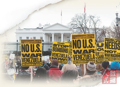 1月3日,美国华盛顿特区,示威人群在白宫前手持标语,反对美国在委内瑞拉开展军事行动。 |