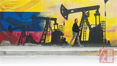 1月6日,委内瑞拉首都加拉加斯当地居民走过一幅绘有油泵和油井的壁画。 |
