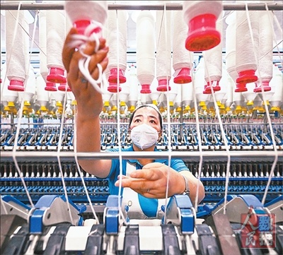 四川眉山仁寿县一家纺织公司生产车间,工人在赶制订单。 潘 帅摄(影像中国)