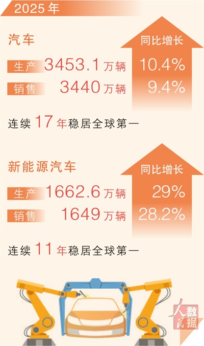 本报北京1月14日电 (记者王政)中国汽车工业协会14日发布的最新数据显示:2025年,我国汽车产销分别完成3453.1万辆和3440万辆,同比分别增长10.4%和9.4%,连续3年保持3000万辆以上规模,连续17年稳居全球第一。