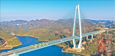 1月13日,贵州贵阳,贵安扩容高速控制性工程百花湖大桥顺利完成荷载试验,标志着该桥通过通车前的全面“体检”,为全线通车奠定基础。建成后,贵安扩容高速将成为贵州省第一条智慧高速。图为百花湖大桥在进行静载试验。