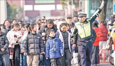 进入冬季以来,江苏省淮安市公安部门联合学校在校园周边采用“定岗定责、高峰疏导、平峰纠违”的工作模式,维持交通秩序,保障群众出行安全。图为1月14日,辅警在淮安市北京北路引导学生过马路。