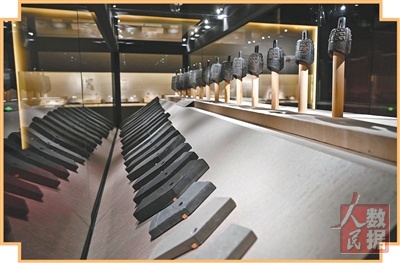 考古成果展上展出的青铜编钟和石编磬。 |