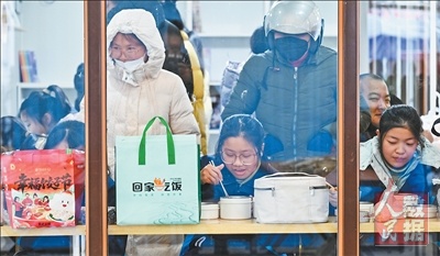 图为1月19日,江苏省泰州市姜堰区实验初级中学学生在“护学空间”享用家长送来的午餐。由老旧车棚改造而成的“护学空间”,外观新颖、设备齐全,受到学生、家长欢迎。