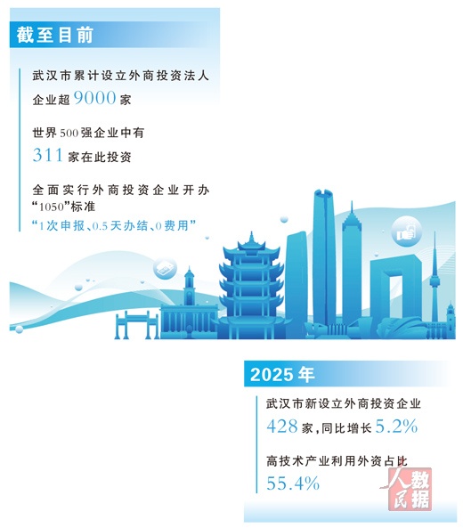 截至目前,武汉市累计设立外商投资法人企业超9000家,世界500强企业中有311家在此投资。2025年,武汉新设立外商投资企业428家,同比增长5.2%,高技术产业利用外资占比达55.4%。