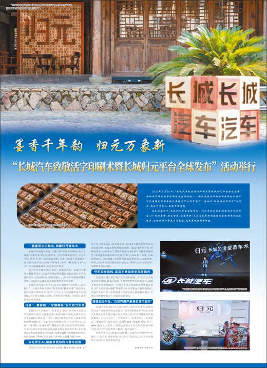 2026年1月16日,“长城汽车致敬活字印刷术暨长城归元平台全球发布”活动在中国木活字印刷术活态传承地——浙江省温州市瑞安市东源村和位于河北省保定市的长城汽车技术中心同步举行。活动以“致敬活字印刷术”为形式,共话千年匠心,致敬中国智慧。