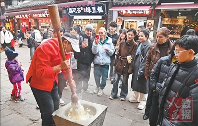 随着中国“免签朋友圈”不断扩大、免签停留期限延长等政策实施,外国游客入境中国更加便利。重庆市积极开发面向入境游客的旅游产品,受到游客欢迎。图为近日,重庆市沙坪坝区的磁器口古镇,中外游客正在观看特色美食制作。