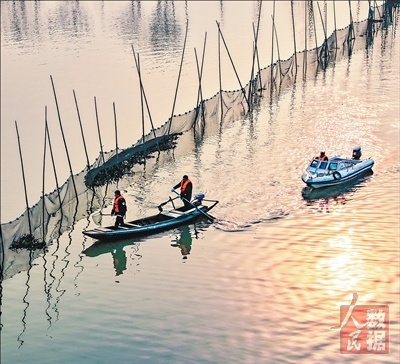 近年来,湖北省黄冈市浠水县践行绿色发展理念,通过开展退渔还湖等举措,守护碧水蓝天。图为浠水县策湖国家湿地公园,党员志愿者在湖面清理漂浮物。