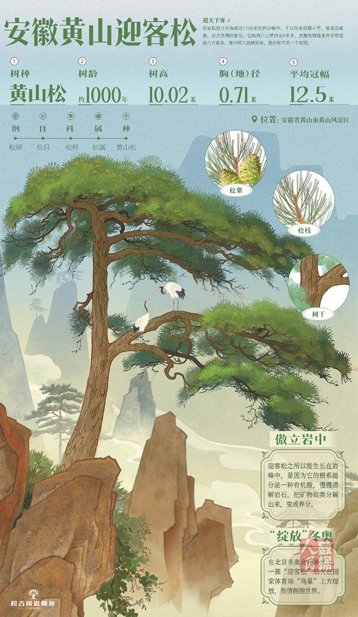 年复一年,胡晓春、吴贻军等守护者的心血已深深镌刻进古松的年轮里。在黄山,迎客松承载的内涵早已超越了植物的范畴——扎根岩石、顶风傲雪,坚韧不拔的品格鼓舞人心;枝丫伸展的“迎客”姿态,更被赋予热情好客的文化内涵。迎客松还多次被作为国礼元素,传递中国人民的友好情谊。