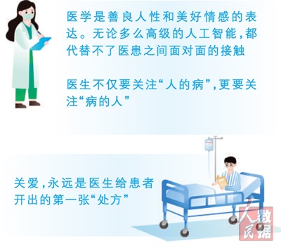 时代在发展,技术在进步,但医学人文不会过时。林巧稚有句名言:“医生要永远走到病人床边去,做面对面的工作,单纯依赖检验报告进行诊断治疗是危险的。”未来,无论人工智能如何发达,医生都要眼中有病、心中有人。关爱,永远是医生给患者开出的第一张“处方”。