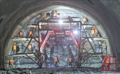 1月22日,甬舟铁路项目舟山本岛段双石岩隧道进口段掘进施工现场,工人们正操纵风钻在掌子面进行打孔作业,同时隧道二衬也在同步跟进。目前,两端掘进合计已经过半。