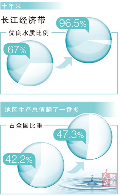优良水质比例从67%提升到96.5%,与此同时,地区生产总值翻了一番多,占全国比重从42.2%提升到47.3%。