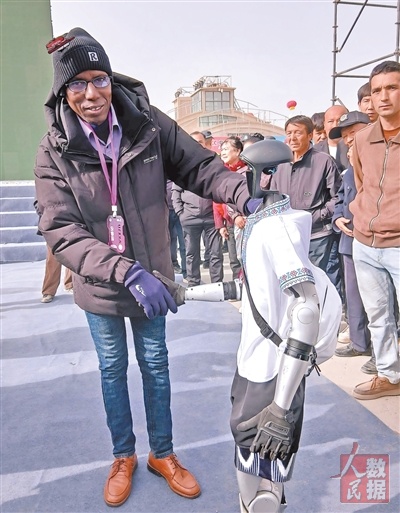 在第十一届新疆特色果品(阿克苏)交易会开幕式上,巴尔德与人形机器人互动。 |