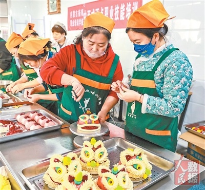 2月2日,内蒙古呼和浩特市扬帆职业培训学校里,展开了一场免费职业技能培训。图为学员们在老师指导下学习制作花馍,以非遗传统手艺传递新春美好祝愿。 丁根厚摄(影像中国)