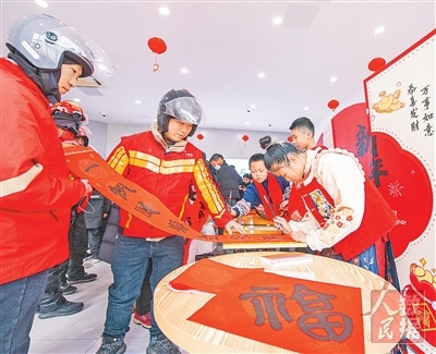 2月4日,江苏宿迁经开区黄河街道泰和社区,暖“新”驿站里满是喜迎新春的氛围。这里举行的写春联、画糖画等活动,吸引许多社区居民和新就业形态人员到场参与、亲身体验。图为活动现场,孩子们为快递小哥写春联。 徐江海摄(影像中国)