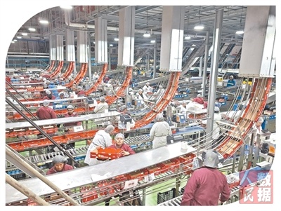 在智利一处车厘子包装车间内,工人们忙碌于流水线旁,将刚刚采摘的车厘子逐一分拣、装箱。 |