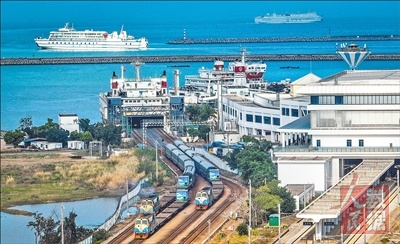 2月6日,一列载有旅客的列车驶入海南海口南港码头,在精准对位后,被分成多段推入海南铁路渡轮船舱,以“火车坐船”的方式跨越琼州海峡。