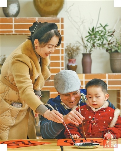2月3日,四川省乐山市金苹果邦泰幼儿园内,外国友人和老师一起写“福”字。 |