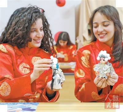 2月8日,山东科技大学举办“非遗里的中国年”文化体验活动,两名外国留学生在展示自己制作的绢人工艺品。 |