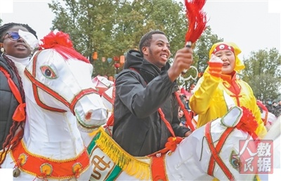 2月7日,外国留学生在江苏省句容市举办的年货大集活动中体验“马灯阵舞”表演。 |