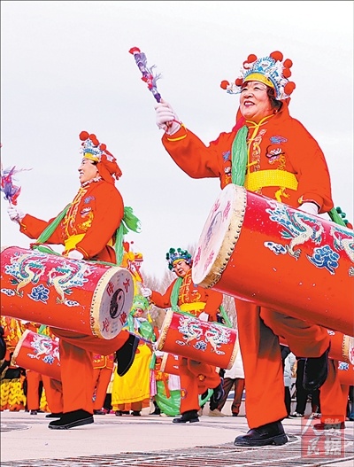 甘肃张掖云海民俗文化艺术团的队员们,在广场上排练《太平鼓》节目,准备在春节期间为广大市民呈献精彩演出。 王 将摄(人民视觉)