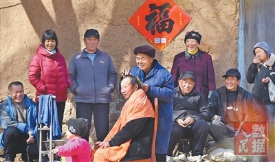 图为2月9日,田传府(右五)在为村里的老人理发。