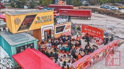 图为2月9日,临近农历小年,在建德市更楼街道司机之家,货车司机和其他外来务工人员一起参加“奔走千里路·幸福一家亲”团圆年夜饭活动。