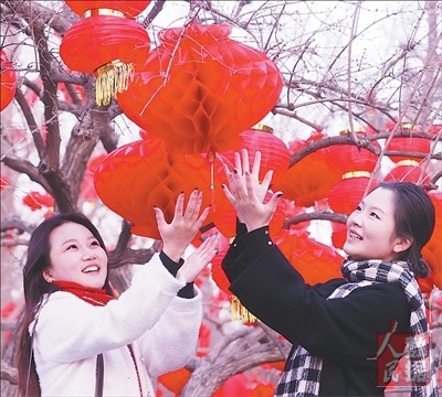 春节临近,北京地坛春节文化庙会进行布景工作,园内红灯笼陆续挂起。图为两名游客在北京地坛公园与灯笼合影。 陈晓根摄(影像中国) |