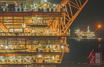 图为夜幕下,锦州23—2油田平台灯火通明。