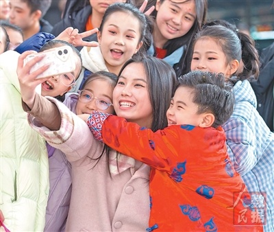 湖南长沙南站,旅客们在自拍合影,记录新春旅途的欢乐瞬间。 陈俊彦摄(人民视觉)