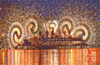 河南洛阳市隋唐城遗址植物园,水上打铁花正在上演。 黄政伟摄(新华社发)