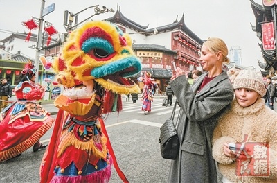 上海豫园举行舞狮等非遗巡游活动,吸引外国游人驻足观看。 李宝洋摄(影像中国)