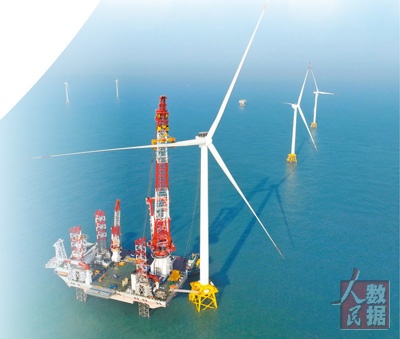 位于福建闽南海域的“大桥海风”号2000吨自升式海上风电安装平台和20兆瓦风电机组吊装现场俯瞰。 |