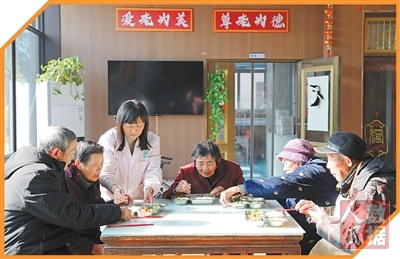 江苏省海安高新区隆政街道德兴村,护理人员在亲上亲养老小院照顾老人用餐。 |