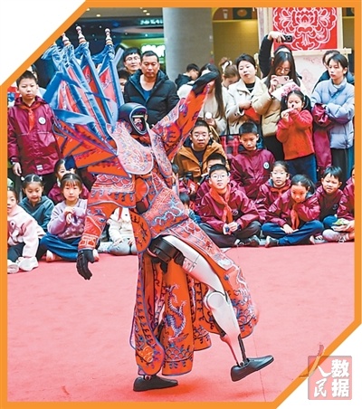 浙江省金华市金华之光文化广场科技馆内,人形机器人身着戏服表演传统婺剧。 |