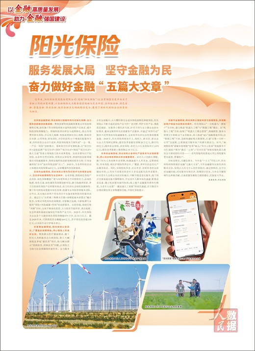 近年来,阳光保险集团股份有限公司(简称“阳光保险”)认真贯彻落实党中央关于金融工作的决策部署,以金融保险之力服务国家战略与民生所需,在科技金融、绿色金融、普惠金融、养老金融、数字金融五大领域精准发力,展现了新时代保险企业的责任与担当。
