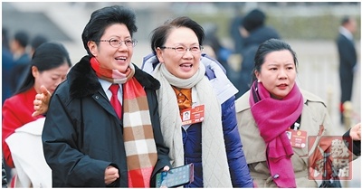 3月7日,全国政协十四届四次会议第二次全体会议开始前,女委员在人民大会堂东门外合影。 |