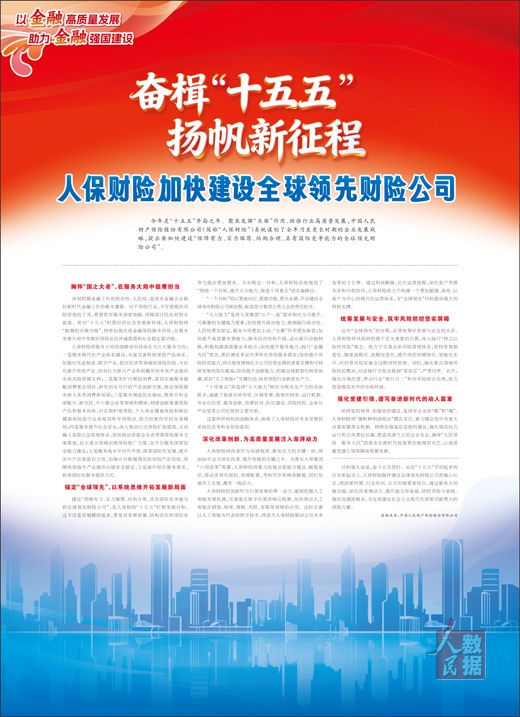 今年是“十五五”开局之年。聚焦发挥“头雁”作用、助推行业高质量发展,中国人民财产保险股份有限公司(简称“人保财险”)系统谋划了全年乃至更长时期的企业发展战略,提出要加快建设“保障有力、实力雄厚、结构合理、具有国际竞争能力的全球领先财险公司”。