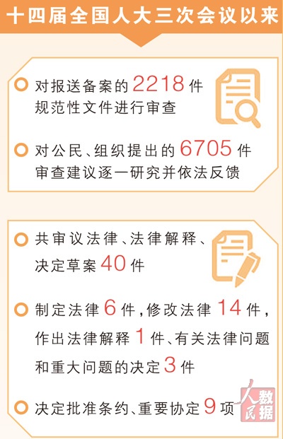 加强经济领域立法,完善社会民生领域立法,健全生态环境领域立法……全国人大常委会工作报告介绍了十四届全国人大三次会议以来的立法工作,给代表们留下了深刻印象。