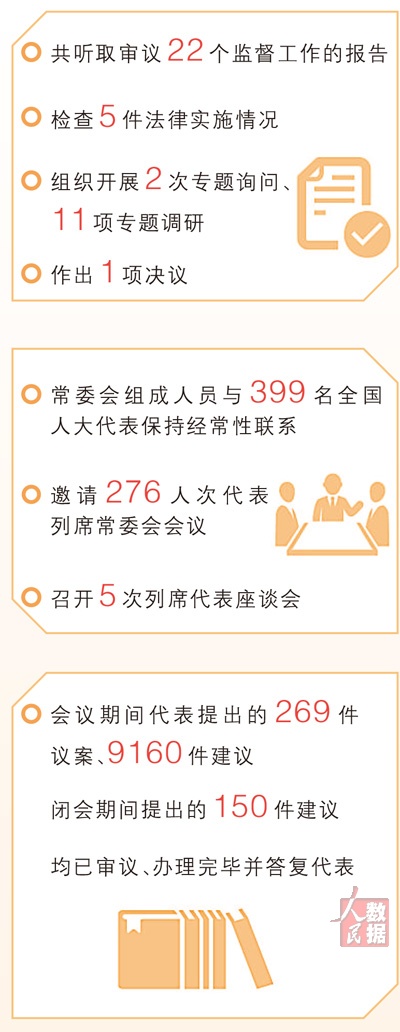 “一年来,共听取审议22个监督工作的报告,检查5件法律实施情况,组织开展2次专题询问、11项专题调研,作出1项决议……报告中这一串数字体现了全国人大常委会监督工作不断走深走实。”北京金诚同达律师事务所高级合伙人方燕代表说,去年,她参与全国人大常委会开展的食品安全法执法检查。检查过程中她感受到全国人大常委会监督工作的力度、温度、深度。这样的监督切实增进了人民群众的根本利益与长远福祉。