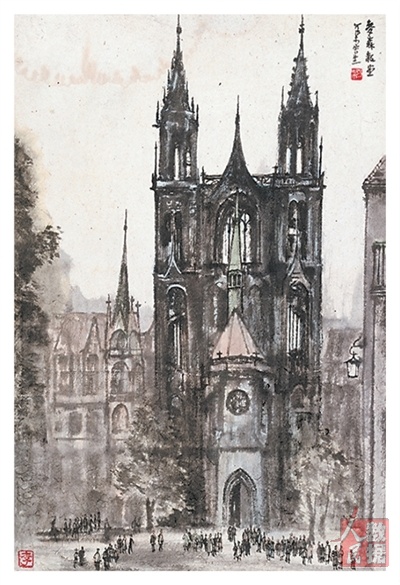 当手机屏幕上的水彩画和眼前冬雾中的实景并置,我不禁感叹东方笔墨精准再现,万物无以遁形,更折服于李可染“丹青入巧思”,他有意缩小画中人的身高,反衬哥特式建筑的峻拔。其他中德间千丝万缕的故事,也藏在这张水彩画里。