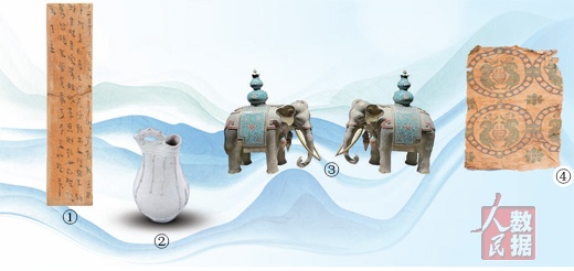 图①:考古工作者修复的简牍。 荆州文物保护中心供图 图②:辽代白釉鸡冠壶。 中国民族博物馆供图 图③:清代掐丝珐琅太平有象。 故宫博物院供图 图④:唐代黄地对饮锦。 中国民族博物馆供图