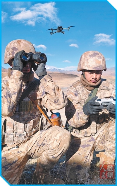 西藏军区某部昆木加哨所官兵正在操纵无人机开展巡逻。 |