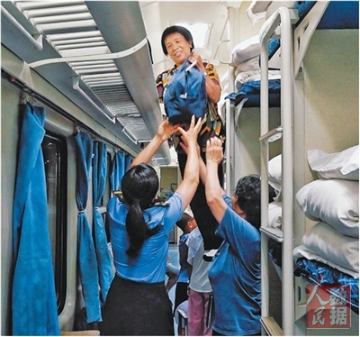 硬卧车厢内,列车工作人员正合力帮助一名老年旅客将行李放置到行李架上。 |