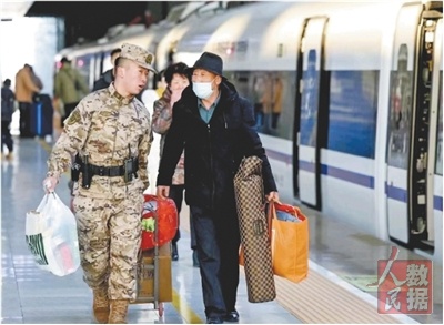 甘肃兰州,兰州西站,武警甘肃总队兰州支队执勤官兵帮助老人提行李。 |
