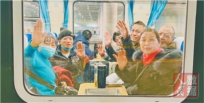 浙江宁波,旅客们透过车窗热情挥手。 |