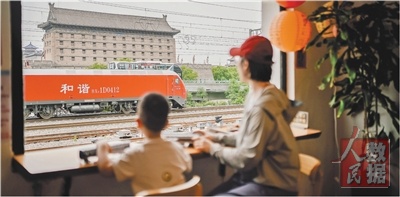 陕西西安新城区安远门附近一家火车主题咖啡馆,家长带孩子坐在窗前看火车从城墙前驶过。 |