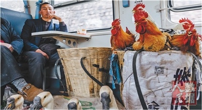成昆铁路5634次慢火车上,四川大凉山的乡亲们带着家禽去赶场。 |