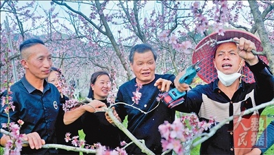 江西德兴市农业农村局深入开展高素质农民培训工作,对参加过培训的学员进行后期跟踪服务与回访,检验培训实效,帮助学员回乡创业时学有所用、学有所成。图为3月25日,果树种植“土专家”(右二)来到德兴市昄大乡港首村学员徐耀顺的黄桃种植基地,指导其进行桃花授粉、防虫及日常管理。