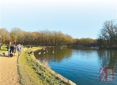 位于布鲁塞尔市郊的坎贝尔森林湖兼具蓄洪功能。图为市民在湖畔散步休闲,尽享惬意时光。 |